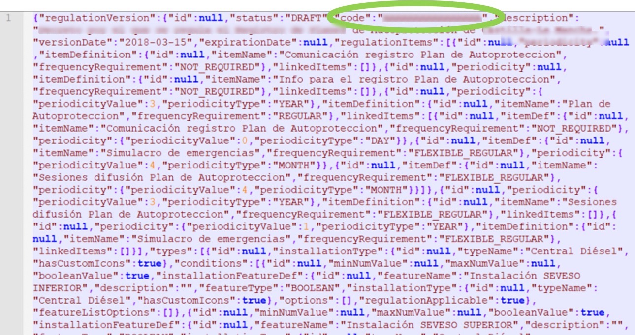 Para que sea posible importar de nuevo el archivo JSON será necesario cambiar, al menos, el valor de la propiedad ‘code’ utilizando cualquier editor de texto. Este valor hace referencia al nombre de la normativa.