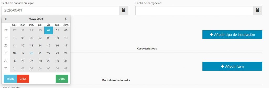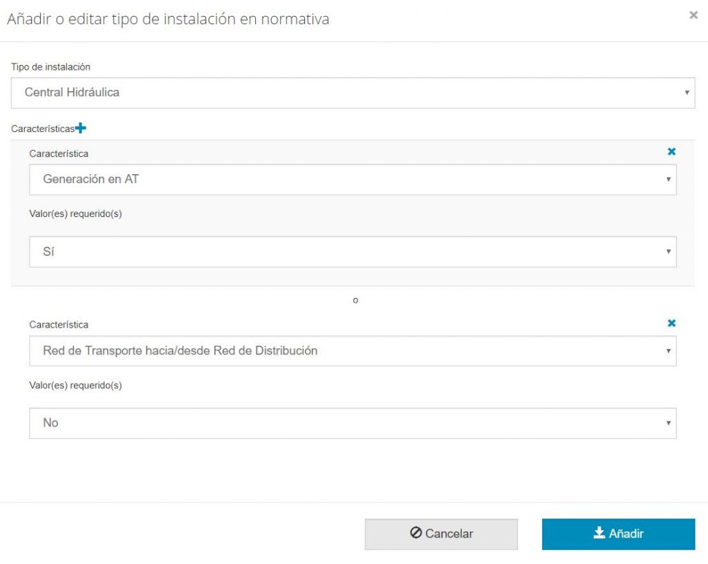 6. Tipos de instalación: en este campo se seleccionan a qué tipo de instalación afecta la normativa, pulsando ‘+ Añadir tipo de instalación’ en caso de que ya exista el tipo de instalaciones que se quiera introducir o ‘Configurar tipos de instalación…’ si se quiere crear o modificar una nueva instalación (para crear una nueva instalación es necesario introducir el nombre y los iconos que van a aparecer en el mapa inicial). Al añadir la instalación se debe escoger el tipo de instalación en el desplegable y añadir (con el botón ‘+’) qué características debe cumplir la instalación para que se le aplique la normativa. No añadir ninguna característica implica que la normativa afecta a todas las instalaciones de ese tipo.