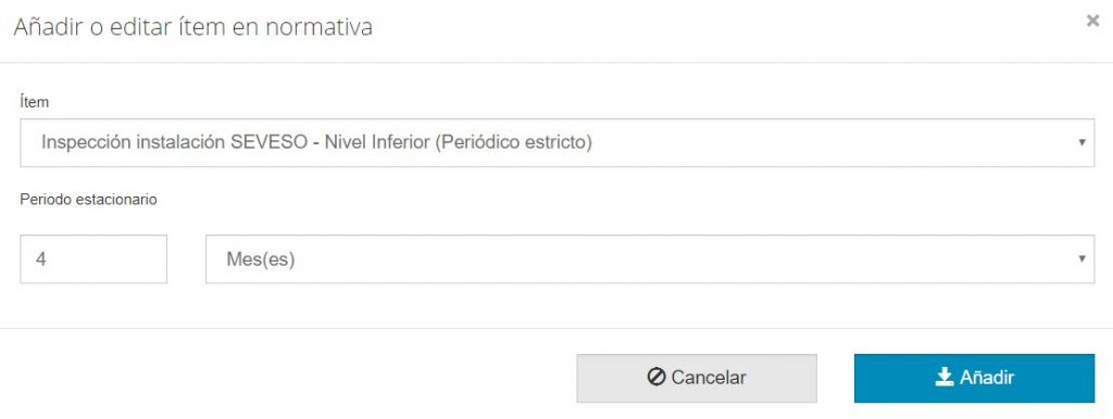 7. Ítems en normativa: en este campo se seleccionan los ítems que marca la normativa, pulsando ‘+ Añadir ítem’ en caso de que ya exista el ítem que se quiera introducir o ‘Configurar ítems…’ si se quiere crear o modificar un nuevo ítem (para crear un nuevo ítem es necesario introducir el nombre y la frecuencia). Al añadir el ítem se selecciona en el desplegable un ítem ya creado, y si el ítem tiene alguna periocidad el periodo estacionario.