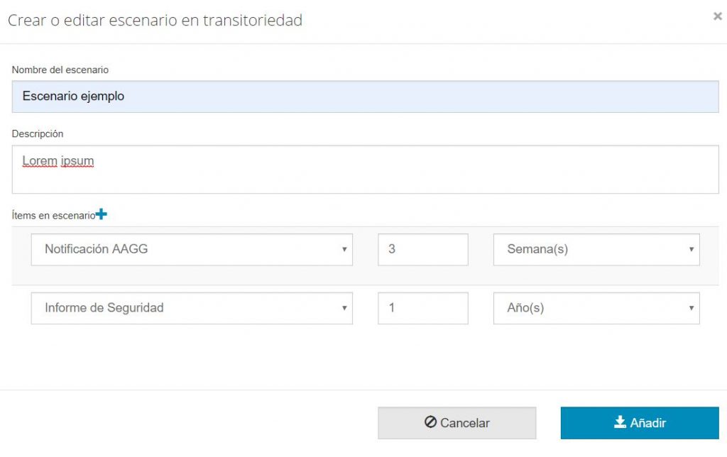 9. Escenarios de transitoriedad: si en el punto 5 se ha deslizado el botón, automáticamente se habilita el campo que permite añadir escenarios de transitoriedad. Pulsando el botón ‘+ Añadir escenario’ se abre una ventana donde se debe introducir el nombre del escenario, una descripción y con el botón ‘+’ añadir los ítems de escenario.