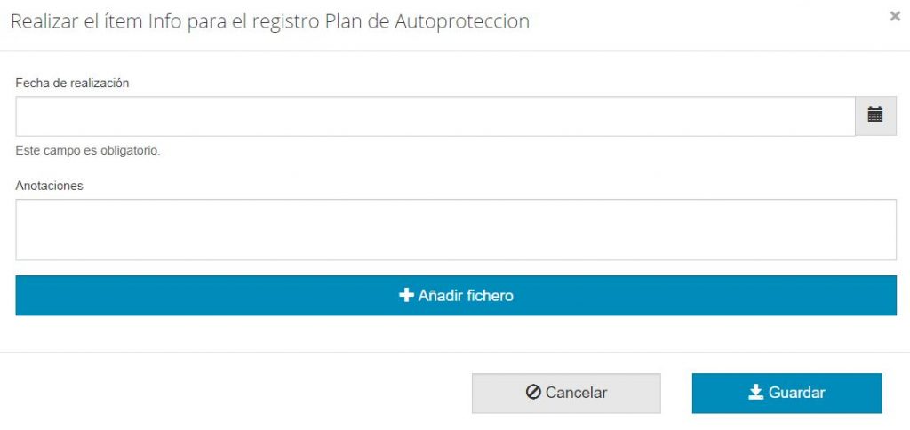 En la ventana emergente se debe indicar la fecha de realización. También se pueden incluir anotaciones o añadir ficheros. Los formatos que acepta el sistema son .xls,.xlsx,.doc,.docx,.pdf.ppt,.pptx no superiores a 45MB.