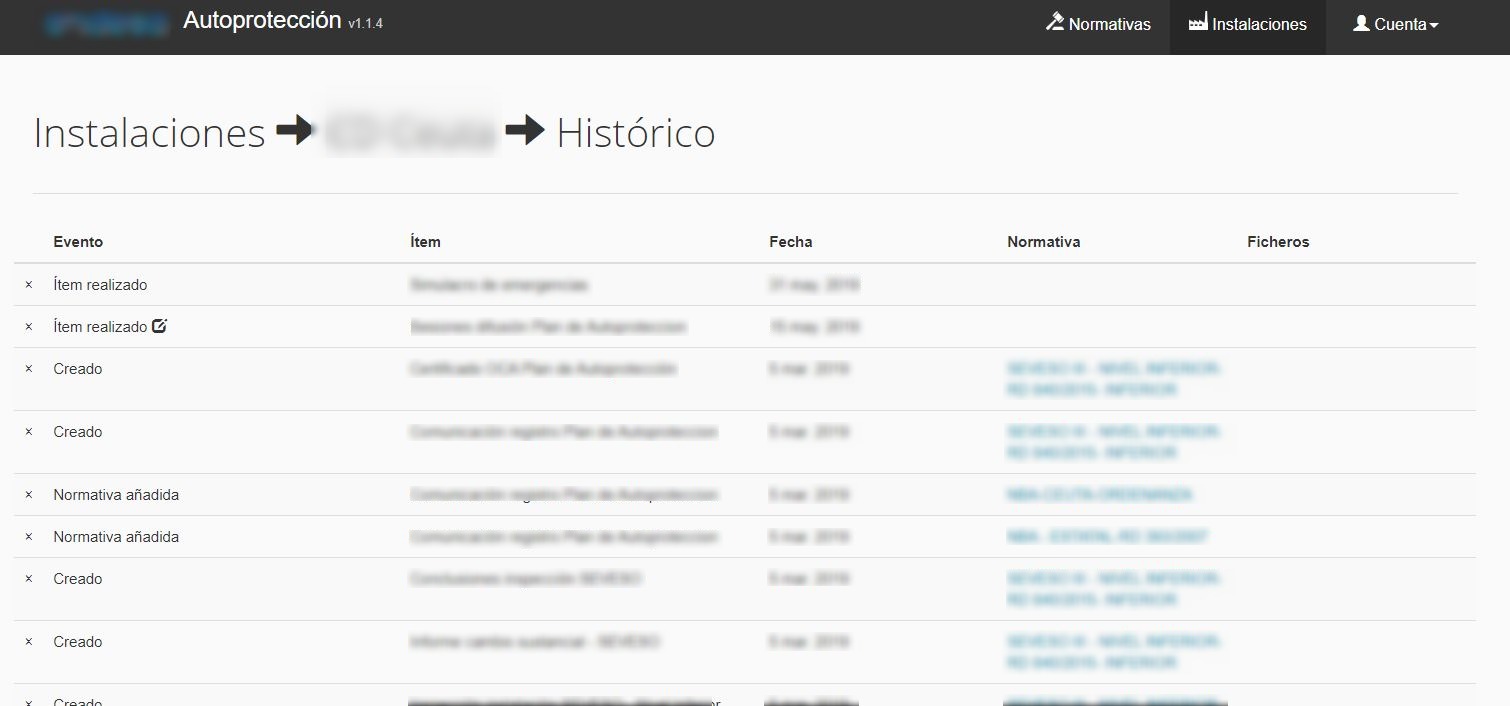 En el histórico se muestra un listado, ordenado del más reciente al más antiguo, los eventos relacionados con la instalación. Los campos que se señalan son: